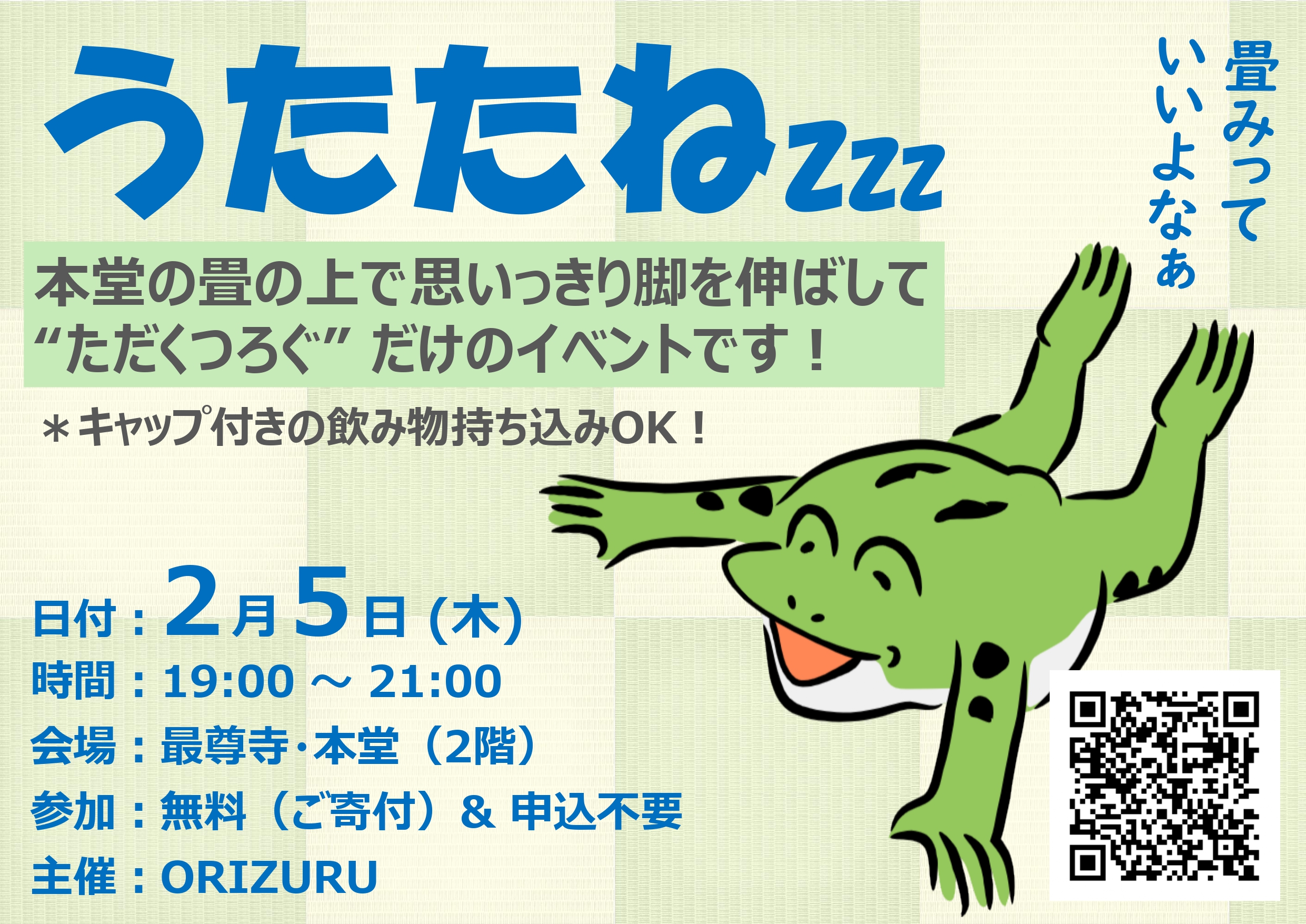 お知らせ「うたたねzzz」 第9回 うたたねzzz 寒さが厳しくなってきました、2階ルーフでもゆっくりできます♪(状況によって2階奥の座敷も解放します。)寺を覗く感じで、お気軽に出入りください♪ 任意団体 ORIZURUさん主催です。お気軽にどう...お知らせ
